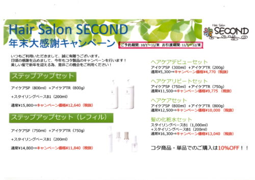 \年末大感謝祭キャンペーン/25 10月, 2019 in (インチ) コラム by HAir SAlon SECONDこんにちは!!今年もとても暑い日が続きましたが、だんだん涼しくなってきて、あと2ヶ月であっという間に年末がきますね!今年もお店で使ってるCOTAの商品がお得に買えるキャンペーンをします!!!詳しくはこちら↯↯ご予約期間10月~11月末までセットでも単品でもお得になってるので、今使ってる方や違うのを使ってる方も是非この機会にCOTAを使って健康でつやつやな髪の毛を保てるようにしていきましょう~~!!^@^